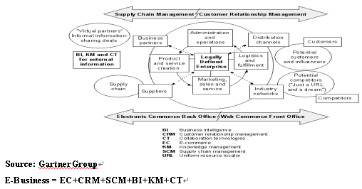 在 GartnerGroup 的一個(gè)名為“如何制定一個(gè)可操作的、有效的電子商務(wù)戰(zhàn)略”的報(bào)告中描述了電子商務(wù)(E-Business)的所有基本要素,他們是商業(yè)智能(BI),客戶關(guān)系管理(CRM),供應(yīng)鏈管理(SCM),知識(shí)管理(KM), 協(xié)同技術(shù)(CT) 和E-Commerce。這些要素將成為新的一輪電子商務(wù)浪潮的特征。一些公司如 Dell, IBM,已經(jīng)成為這一輪變革中成功的代表。