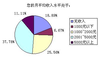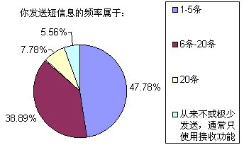 以上選擇中,選擇答案A~E的被訪者比例分別為18.89%、6.67%、25.56%、37.78%和11.11%,也就是說我們這次調(diào)查的重頭是放在一般收入水平和無收入(學生)兩類人群,這兩個人群也正是SMS市場上最活躍的分子。高收入和低收入人群要么因為資金充裕而選擇語音業(yè)務,要么就是因為資金的缺乏而盡量不使用移動通信方式。