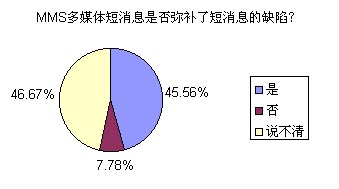 問卷的調(diào)查結(jié)果有些屬于意料之中,有些則暫一定程度上給運營商和終端提供上潑了冷水。不過,有一點是讓提供移動服務的企業(yè)感到欣慰和滿意的,那就是:最終用戶對MMS的接受程度相當高,除去對資費、操作的質(zhì)疑外,幾乎90%以上的用戶都認為MMS廣泛流行是一個必然的趨勢。下面我們就讀者們廣泛關注的問題來研究一下。
