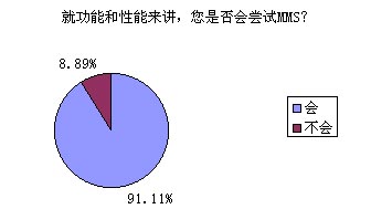 題8的調(diào)查結(jié)果對于中國移動來講絕對是充滿誘惑的,高達91.11%的被訪者表示他們非常愿意嘗試MMS的功能和服務,無疑這對ICP們(MMS服務的重要載體)也是一針強心劑。