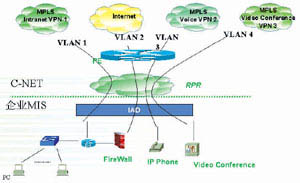 VPN中,實(shí)現(xiàn)業(yè)務(wù)在VLAN 和VPN中的無縫對接,以保證用戶數(shù)據(jù)的安全、高效傳輸;接入網(wǎng)采用基于RPR或SDH的MSPP環(huán)實(shí)現(xiàn)IP業(yè)務(wù)和TDM業(yè)務(wù)的綜合傳輸;在商業(yè)樓宇內(nèi)主要采用IAD設(shè)備將客戶的數(shù)據(jù)、語音、專線等業(yè)務(wù)接入CNC