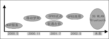 2000年5月,中國(guó)移動(dòng)推出了WAP服務(wù),但是由于準(zhǔn)備不足,加之中國(guó)移動(dòng)沒有完全轉(zhuǎn)變經(jīng)營(yíng)理念,使得WAP服務(wù)沒有達(dá)到預(yù)期的發(fā)展目標(biāo)。在吸取WAP服務(wù)的經(jīng)驗(yàn)、教訓(xùn)后,中國(guó)移動(dòng)于2000年11月又推出了“移動(dòng)夢(mèng)網(wǎng)”計(jì)劃。在這次的業(yè)務(wù)推廣中,短消息受到了人們的寵愛,發(fā)展到現(xiàn)在,SMS已經(jīng)深入多數(shù)移動(dòng)用戶的心中。2001年7月,中國(guó)聯(lián)通也推出了“聯(lián)通在信”與“移動(dòng)夢(mèng)網(wǎng)”進(jìn)行競(jìng)爭(zhēng)(如圖1所示)。與此同時(shí),中國(guó)移動(dòng)又開始了GPRS的試點(diǎn)工作,經(jīng)過(guò)近一年時(shí)間,“聯(lián)通在信”并沒有取得更好的成績(jī),而中國(guó)移動(dòng)的GPRS終于開始正式商用。那么,未來(lái)的移動(dòng)數(shù)據(jù)業(yè)務(wù)將依托什么來(lái)發(fā)展呢?是3G,還是WLAN、藍(lán)牙?大家只能拭目以待。