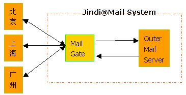 如果選用Jindi MailServer作為外部郵件服務器,可以在同一臺外部郵件服務器上配置可選的MailGate模塊,該模塊可以將指定域用戶的郵件進行定向投遞,而不依賴DNS的配置。內部郵件通過內部DNS在郵件網(wǎng)關處進行存儲轉發(fā)到外部。