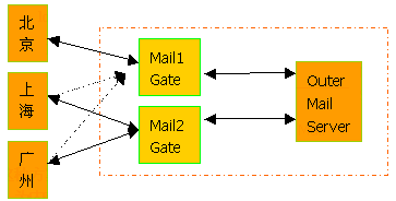 1.正常工作時北京的內部郵件服務器通過Mail1 Gate與外部郵件服務器通訊,上海、廣州通過 Mail2 Gate與外部郵件服務器通訊;