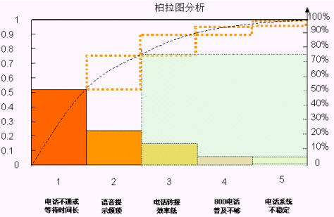 通過匯總的數(shù)據(jù)進(jìn)行分析,他們發(fā)現(xiàn)客戶不滿意的原因很多,于是選取了最大的五個原因, 用"柏拉圖"做了分析,同時,對于這最重要的五個原因又作了一次頭腦風(fēng)暴和"魚骨圖分析"。
