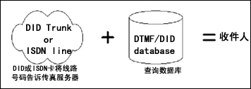 使用ISDN或DID,用戶可以方便地獲得屬于自己的傳真號碼而無須再架設(shè)單獨(dú)的物理線路。從電信局申請ISDN或DID服務(wù)后,用戶會獲得一組電話號碼,然后將號碼分配給用戶或部門,再安裝相應(yīng)的ISDN或DID卡。當(dāng)有傳真撥入時,ISDN或DID卡會自動檢測對方撥的是哪一個號碼,并將號碼通知給傳真服務(wù)器。傳真服務(wù)器查詢用戶數(shù)據(jù)庫,然后將傳真轉(zhuǎn)給擁有該號碼的用戶,如圖1所示。