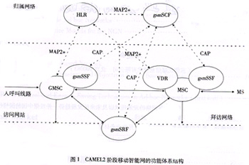 在移動通信領域,歐洲電信標準學會(ETSI)制定的CAMEL系列標準為基于GSM移動通信網(wǎng)絡的移動智能網(wǎng)提供了統(tǒng)一的規(guī)范。其中CAMEL2階段的標準符合ITU-T的IN CS-1,支持各種基于語音的智能業(yè)務。CAMEL2階段移動智能網(wǎng)的功能體系結構如圖1所示。CAMEL3階段的標準基于CS-2,主要增加了對GPRS移動數(shù)據(jù)業(yè)務以及短消息業(yè)務的支持。
