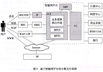鑒于以上原因,目前中國移動正在建設的全國范圍的小額支付系統(tǒng)已確定采用基于智能網(wǎng)平臺的建設方式;谥悄芫W(wǎng)平臺的小額支付系統(tǒng)如圖4所示。