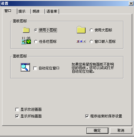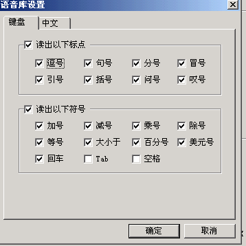 如果需要進(jìn)一步的調(diào)整,可以選擇菜單里的“設(shè)置……”。打開設(shè)置窗口(如圖3)。窗口共分四個選項,每個選項里除了剛介紹的幾種常用功能調(diào)整外,還可以控制歡迎畫面、開始畫面、設(shè)定存儲等功能,規(guī)定提示速度、朗讀速度的快慢,選擇提示方式,設(shè)定提示報警條件。在“語音庫”選項中還可以選擇朗讀為男聲還是女聲。單擊“設(shè)置”按鈕,可以根據(jù)具體需要選擇“鍵盤”或“中文”里被朗讀標(biāo)點符號的種類(如圖4)。