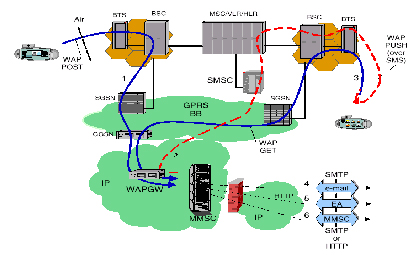·圖中第一條消息流顯示了多媒體消息由BTS、BSC、SGSN和GGSN到達IP網絡,通過WAP Gateway被轉發(fā)到MMSC中。