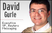 他作為路透社協(xié)作服務(wù)部負(fù)責(zé)人、微軟前高層領(lǐng)導(dǎo)正在試圖將路透消息服務(wù)變?yōu)楹蛯κ指偁幍脑囼?yàn)廠。自從2003年4月份加盟路透以來,Gurle已經(jīng)敲定了和美國在線即時(shí)消息器