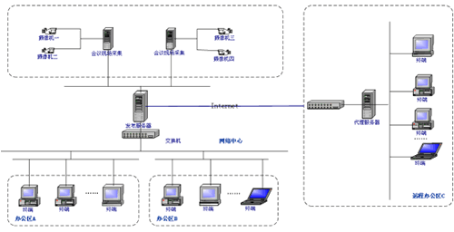 下屬各單位辦公區(qū)的工作終端或遠(yuǎn)程(Internet)終端,可以連接到中心機(jī)房的轉(zhuǎn)播服務(wù)器上進(jìn)行接收數(shù)據(jù)。用戶只需直接打開(kāi)IE瀏覽器然后輸入轉(zhuǎn)播服務(wù)器的IP地址或者相關(guān)鏈接,進(jìn)入到正在直播的會(huì)議現(xiàn)場(chǎng),實(shí)現(xiàn)遠(yuǎn)程實(shí)時(shí)參與會(huì)議的目的。