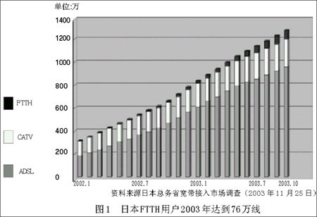 從現(xiàn)狀看,在亞洲發(fā)展FTTH比較迅速的是日本和韓國,早在20世紀90年代初期日本就制定了雄心勃勃的計劃:2010年使光纖進入全國家庭。2001年以來,日本FTTH市場進入快速增長階段:2001年只有usen和NTT東日本、NTT西日本幾家公司,而到2002年7月,已經(jīng)有9家公司提供FTTH業(yè)務。據(jù)日本總務省統(tǒng)計,到2004年7月,日本FTTH用戶數(shù)已經(jīng)突破130萬,預計在2005年達到450萬。