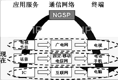 完全融合方式 完全融合的典型技術(shù)解決方案是目前業(yè)界普遍關(guān)注的焦點—NGN(下一代網(wǎng)絡(luò))。NGN的核心思路是重新生產(chǎn)和建立符合標(biāo)準(zhǔn)的服務(wù)、網(wǎng)絡(luò)和終端,徹底取代原有相對獨立的應(yīng)用服務(wù)、通信網(wǎng)絡(luò)和終端。由于技術(shù)標(biāo)準(zhǔn)制定復(fù)雜,網(wǎng)絡(luò)設(shè)備投資巨大,實施周期過長等因素,實現(xiàn)起來困難較大。