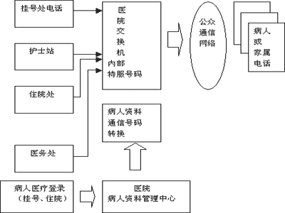 病人資料數(shù)據(jù)庫(kù)保存的病人資料均與病人住院、就診代號(hào)對(duì)應(yīng),醫(yī)護(hù)人員因工作需要欲與病人或家屬聯(lián)系時(shí),使用本部門的電話通過(guò)呼叫中心獲得使用權(quán)限。交換機(jī)給醫(yī)院內(nèi)部指定一個(gè)"特服號(hào)碼",負(fù)責(zé)與病人通信。