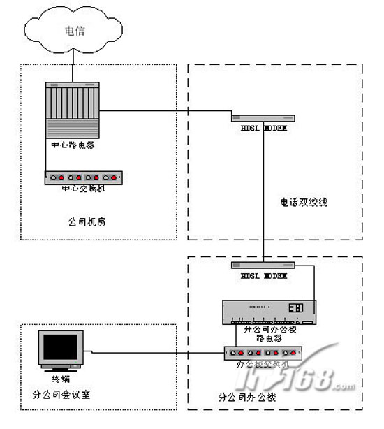 MODEM,就可以實現(xiàn)用戶到電信骨干網(wǎng)的網(wǎng)絡接入。網(wǎng)絡中心機房的HDSL MODEM通過V.35線纜直接接入到網(wǎng)絡中心的路由器上,用戶的HDSL