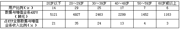 表4 KTF各年齡用戶群數(shù)據(jù)與增值業(yè)務(wù)消費(fèi)能力對比(2004年1~9月)