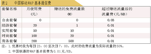 1X的優(yōu)勢是技術(shù)先進,速度快,但部分地區(qū)網(wǎng)絡覆蓋不足,開通國際漫游數(shù)據(jù)業(yè)務的國家少。此外,在收費上雙方也有不同。表2是中國移動與中國聯(lián)通WAP基本通信費比較(各省之間略有不同)。