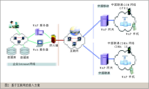 在這種方式中,企業(yè)員工無論使用GSM還是CDMA制式手機均可以訪問WAP服務器,即使國際漫游狀態(tài)也可以通過當?shù)氐?.5G(或2G)網(wǎng)絡登錄Internet訪問企業(yè)的信息,WAP手機設置采用運營商提供的標準設置,具有較強的技術(shù)通用性。