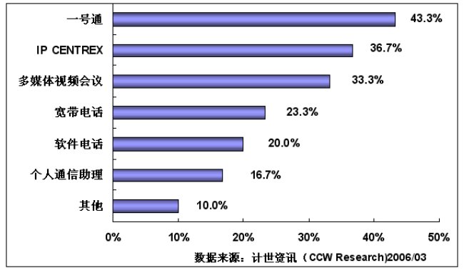 通過計(jì)世資訊(CCW Research)的調(diào)研可以看到,行業(yè)用戶對(duì)一號(hào)通、IP-CENTREX、多媒體視頻會(huì)議和寬帶電話等基于NGN平臺(tái)開發(fā)的業(yè)務(wù)比較感興趣,其中:對(duì)一號(hào)通感興趣的用戶達(dá)到43.3%,對(duì)IP-CENTREX感興趣的用戶為36.7%,對(duì)多媒體視頻會(huì)議感興趣的用戶達(dá)到33.3%,對(duì)寬帶電話感興趣的用戶達(dá)到23.3%,對(duì)軟件電話感興趣的用戶達(dá)到20.0%,對(duì)個(gè)人通信助理感興趣的用戶達(dá)到16.7%。