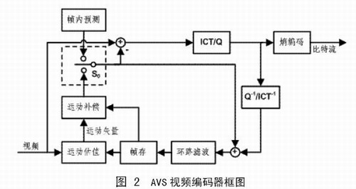 AVS視頻標準定義了I幀、P幀和B幀三種不同類型的圖像,I幀中的宏塊只進行幀內預測,P幀和B幀的宏塊則需要進行幀內預測或幀間預測,圖中S0是預測模式選擇開關。預測殘差進行8×8整數變換(ICT)和量化,然后對量化系數進行zig-zag掃描(隔行編碼塊使用另一種掃描方式),得到一維排列的量化系數,最后對量化系數進行熵編碼。AVS視頻標準的變換和量化只需要加減法和移位操作,用16位精度即可完成。