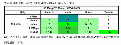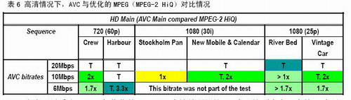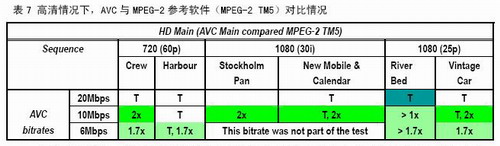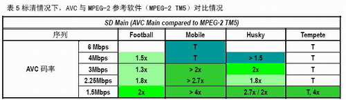 總體上講,AVC與MPEG-2對比,85個比對中66對MPEG-2的碼率要達到1.5倍才能與AVC達到同樣質量,其中51對MPEG-2碼率要達到AVC的2倍才能達到AVC的質量。換句話說,在60%的情況下,AVC的編碼效率能夠達到MPEG-2的兩倍。