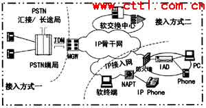 先來(lái)簡(jiǎn)單介紹一下軟交換系統(tǒng)的用戶(hù)接入方式。從軟交換機(jī)放置的等級(jí)區(qū)分,大致可分兩類(lèi):(1)通過(guò)PSTN接入,軟交換機(jī)位于匯接局/長(zhǎng)途局;(2)通過(guò)IP網(wǎng)接入,軟交換機(jī)相當(dāng)于本地端局,如圖1所示。