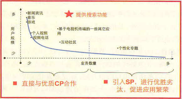 增值業(yè)務(wù)內(nèi)容定位可參考長(zhǎng)尾理論模型。長(zhǎng)尾理論的頭部通常是大眾市場(chǎng),要求產(chǎn)品滿足用戶符號(hào)化的需求,主流業(yè)務(wù)將具備更廣的流行效應(yīng),如新聞、游戲和音樂(lè),頭部的業(yè)務(wù)往往能夠滿足大規(guī)模用戶需求,提供優(yōu)質(zhì)業(yè)務(wù)體驗(yàn);尾部通常是細(xì)分市場(chǎng)和互動(dòng)市場(chǎng),要求業(yè)務(wù)滿足生產(chǎn)與消費(fèi)一體化的需求,體現(xiàn)交互性,為用戶帶來(lái)整合的、一對(duì)一的體驗(yàn),以促進(jìn)IPTV應(yīng)用繁榮。