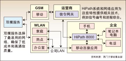 固定/移動網(wǎng)絡(luò)融合(FMC)概念已經(jīng)被炒作了兩年之久,其支持者一直都宣稱該技術(shù)可以將手機和基于室內(nèi)WLAN的無線電話相結(jié)合。今天,供應(yīng)商終于開始部署以特定交換局應(yīng)用為基礎(chǔ)的產(chǎn)品,以及面向手機的客戶端軟件。西門子移動事業(yè)部正在推出針對統(tǒng)一語音網(wǎng)絡(luò)的Hipath MobileConnect產(chǎn)品,而與此同時,新興企業(yè)Divitas網(wǎng)絡(luò)公司也聲稱,其基礎(chǔ)設(shè)施可以充當(dāng)“移動/移動融合”的角色。