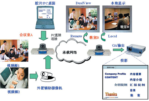會(huì)議中常常需要同時(shí)傳送演講人的演講膠片和演講人的圖像,這套視訊系統(tǒng)非常方便地支持此功能,只需要把演講人的便攜機(jī)用線纜接到會(huì)場(chǎng)的終端上,通過終端的SXGA輸入功能可方便地將膠片信息發(fā)送到遠(yuǎn)端會(huì)場(chǎng),遠(yuǎn)端會(huì)場(chǎng)通過終端的SXGA輸出接口將膠片內(nèi)容通過投影設(shè)備顯示出來,而終端的主視頻輸出接口顯示的是遠(yuǎn)端演講人的圖像。