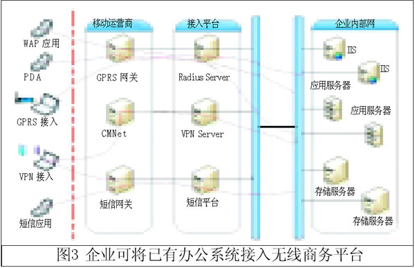該平臺還支持多種用戶接入方式,允許通過多種不同的渠道和訪問設(shè)備,包括筆記本電腦、PDA和移動電話(手機),由GPRS或WLAN等多種網(wǎng)絡(luò)接入辦公系統(tǒng)。具體接入方式包括:   這里介紹的無線商務(wù)平臺適合沒有成型信息系統(tǒng)的企業(yè)接入,對于企業(yè)已經(jīng)建有辦公系統(tǒng)的情況,可以提供專線接入的無線商務(wù)解決方案(如圖3所示),企業(yè)通過專線接入無線商務(wù)平臺,這種情況需要對企業(yè)辦公系統(tǒng)進行一定的改造來實現(xiàn)全部移動辦公功能。