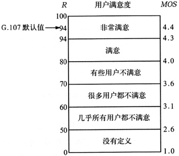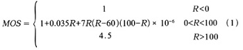 。5)MOS值,MOS模型是主觀評(píng)價(jià)方法,根據(jù)E模型MOS值是通過R值計(jì)算得到的。MOS值是1~5之間的數(shù),1是最差的,5是最好的[6]。R和MOS值的關(guān)系式如下所示:
