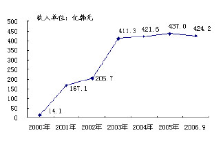 經(jīng)過6年多的運營,韓國電信的eBilling業(yè)務發(fā)展良好,目前與其合作的ICP已達到500多家,內(nèi)容涵蓋了收費郵箱、在線軟件銷售、聊天、娛樂、游戲、漫畫、綜合信息等;業(yè)務收入也逐年上升,從2000年的14.1億韓元(折合人民幣0.11億元)增長到2006年9月份的424.2億韓元(折合人民幣3.3億元),如圖2、圖3所示。