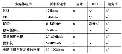 2.0接口相當(dāng),遠(yuǎn)遠(yuǎn)高于無線局域網(wǎng)802.11b的11 Mbit/s,也比下一代無線局域網(wǎng)802.11a/g的54 Mbit/s高出近一個(gè)數(shù)量級(jí)。UWB通信的功耗較低,能更好地滿足使用電池的移動(dòng)設(shè)備的要求。另外,UWB信號(hào)的功率譜密度非常低,信號(hào)難以被檢測(cè)到,再加上采用的跳頻、直接序列擴(kuò)頻等擴(kuò)頻多址技術(shù),使非授權(quán)者很難截獲傳輸?shù)男畔ⅲ蚨踩苑浅:。?是一些典型的實(shí)時(shí)多媒體應(yīng)用對(duì)不同無線傳輸技術(shù)的數(shù)據(jù)傳輸速率的要求。從表中可以看出,如果采用無線的方式來進(jìn)行傳輸,只有UWB技術(shù)可以滿足各種應(yīng)用的要求。