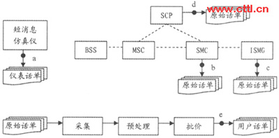 通過對移動點對點短消息計費原理的分析,可以把整個計費過程劃分為兩大環(huán)節(jié):計費點原始話單的生成和后期計費處理系統(tǒng)的處理。如果其中任何一個環(huán)節(jié)出現(xiàn)差錯都會降低用戶計費話單的準確性。因此在測試過程中采取了用戶層面和設備層面相結合的方法:一方面使用仿真儀表大量模擬點對點短消息的發(fā)送和接收,得到用戶話單;一方面分析各個計費點生成的原始話單。