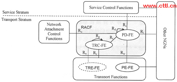 在ITU-T NGN的功能架構(gòu)中,RACF位于業(yè)務(wù)控制層和承載傳送層之間,根據(jù)業(yè)務(wù)應(yīng)用層的請(qǐng)求確定傳送資源的可用性、執(zhí)行接納控制,并對(duì)傳送資源進(jìn)行QoS控制、NAPT/防火墻控制以及NAT穿越。