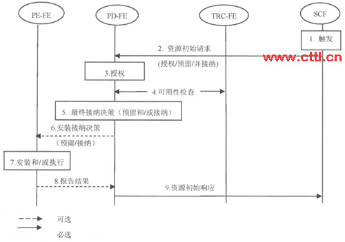 SCF發(fā)起QoS資源控制的授權(quán)、預(yù)留和接納的基本流程可以描述如下。      在業(yè)務(wù)建立過程中或由于內(nèi)部操作使得SCF觸發(fā)Rs接口上的資源初始請(qǐng)求,例如SCF收到或產(chǎn)生業(yè)務(wù)信令消息。      SCF確定或從業(yè)務(wù)的媒體流信息中導(dǎo)出所請(qǐng)求的QoS參數(shù)(如帶寬和業(yè)務(wù)類別),然后通過Rs接口向PD-FE發(fā)送資源初始請(qǐng)求消息,其中包含媒體流描述和相關(guān)QoS參數(shù),以便進(jìn)行QoS資源授權(quán)和預(yù)留。     PD-FE將對(duì)請(qǐng)求的QoS資源進(jìn)行授權(quán),PD-FE將檢查請(qǐng)求消息中的媒體流描述、請(qǐng)求的QoS資源和PD-FE中的網(wǎng)絡(luò)策略規(guī)則、從NASF獲得的傳送清單信息(如定制的上下行帶寬、最大優(yōu)先級(jí)等)是否一致。當(dāng)授權(quán)和預(yù)留分開執(zhí)行時(shí),PD-FE向SCF返回授權(quán)結(jié)果。否則將繼續(xù)下面的步驟。     PD-FE確定媒體通路涉及的接入網(wǎng)和核心網(wǎng)。如果在所涉及的網(wǎng)絡(luò)中有TRC-FE,PD-FE將向已經(jīng)在PD-FE中進(jìn)行注冊(cè)的TRC-FE發(fā)送請(qǐng)求消息檢查相關(guān)網(wǎng)絡(luò)中的資源可用性。如果在所涉及的網(wǎng)絡(luò)中有多個(gè)TRC-FE,TRC-FE之間還需要進(jìn)行信息交互以便確定從網(wǎng)絡(luò)入口邊界到出口邊界之間相關(guān)QoS資源的可用性,收到資源初始請(qǐng)求消息的TRC-FE將向PD-FE回送資源初始響應(yīng)消息。     PD-FE根據(jù)和PE-FE,TRC-FE的交互結(jié)果確定最終的接納決策,如果不接納,PD-FE應(yīng)向SCF回送資源初始響應(yīng)消息,其中包含拒絕原因。      PD-FE將最終的接納決策發(fā)送給PE-FE進(jìn)行策略的安裝。當(dāng)預(yù)留和接納分開時(shí),PD-FE只請(qǐng)求安裝接納決策,并在收到SCF資源接納激活請(qǐng)求時(shí)才發(fā)送另一個(gè)資源初始請(qǐng)求,控制PE-FE開門并激活之前已經(jīng)設(shè)置在PE-FE中的接納決策。當(dāng)預(yù)留和接納一起執(zhí)行時(shí),PD-FE請(qǐng)求PE-FE立即執(zhí)行資源接納決策。     具體流程如圖2所示。