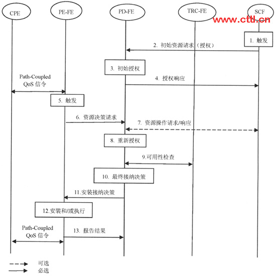 PE-FE收到來(lái)自CPE的Path-Coupled信令的觸發(fā),進(jìn)行資源決策請(qǐng)求。     根據(jù)CPE的QoS請(qǐng)求,PE-FE通過Rw接口向PD-FE發(fā)送資源決策請(qǐng)求消息,其中攜帶媒體流描述和相應(yīng)的QoS參數(shù)。     當(dāng)收到資源決策請(qǐng)求消息時(shí),如果SCF之前收到過針對(duì)該流的QoS初始授權(quán),PD-FE應(yīng)向SCF發(fā)送資源操作請(qǐng)求消息以便獲取和該流相關(guān)的業(yè)務(wù)信息。