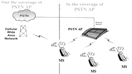 如圖3所示,使用藍(lán)牙CTP MS(mobile station)和PSTN AP,通過本地交換機(jī)與固網(wǎng)相連。其中,MS為雙模終端,可以根據(jù)不同網(wǎng)絡(luò)的資費(fèi)差異預(yù)先設(shè)置采用何種網(wǎng)絡(luò)接打電話。在藍(lán)牙覆蓋范圍內(nèi),根據(jù)設(shè)置,CTP