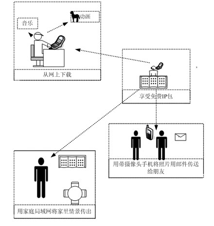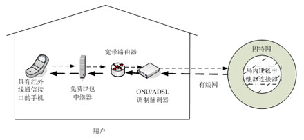 正是基于上述狀況,NTT公司就對FMC的項目,進行了研發(fā),并開發(fā)出了讓有線寬帶接入與手機紅外線通信接口,通過一種中間設(shè)備,讓它們相連,這樣以來,NTT公司ADSL等寬帶接入線路,就會對許多手機用戶提供安全、快速和高質(zhì)量的免費IP包通信,其業(yè)務(wù)框圖,請見圖一。