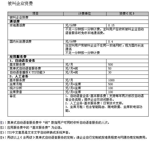 2、被叫企業(yè)資費(fèi)標(biāo)準(zhǔn)如下: