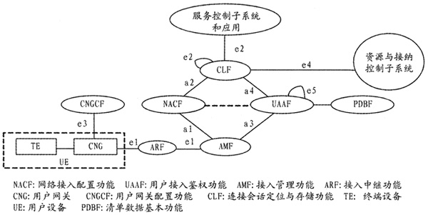 NASS實現(xiàn)IP地址分配、傳送層的認證和授權(quán)、接入網(wǎng)配置、位置信息的管理等功能,在移動或者游牧的場景下,NASS負責(zé)控制終端的接入,完成對用戶附著于接入網(wǎng)絡(luò)的管理。NASS的基本架構(gòu)[4]如圖2所示,由網(wǎng)絡(luò)接入配置功能(NACF)、接入管理功能(AMF)、連接會話定位與存儲功能(CLF)等邏輯功能單元組成。