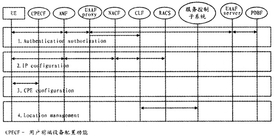 AMF負責(zé)翻譯UE的接入請求,將UE的IP地址分配請求以及網(wǎng)絡(luò)配置參數(shù)請求轉(zhuǎn)發(fā)至NACF,將用戶鑒權(quán)請求轉(zhuǎn)發(fā)給用戶接入鑒權(quán)功能(UAAF),反向則將來自NACF或UAAF的響應(yīng)轉(zhuǎn)發(fā)給UE。