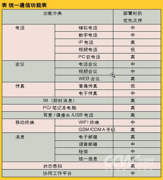 ”、“智能通信”和“統(tǒng)一溝通”等,盡管每個廠商所給出的定義均有些細微的差別,但總體來看,其核心內容就是指將現在各種溝通方式進行融合,目的是讓人們無論是在任何時間、任何地點,都可以通過任何設備、任何網絡實現自由的溝通。目前常用的溝通方式有電話、傳真、短信、email、Web會議、視頻會議、語音信箱、IM軟件、協同工作平臺等等,這些溝通方式覆蓋了電信、IT和互聯網三大領域,因此統(tǒng)一通信是這三大領域逐步發(fā)展、自然融合的結果。