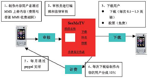 M1新加坡移動運(yùn)營商M1推出了用戶制作及共享視頻業(yè)務(wù)——MeTV,用戶可以通過MMS上傳視頻內(nèi)容,其它用戶可以瀏覽并下載。這項(xiàng)業(yè)務(wù)為用戶提供了一個展示自己和了解他人的平臺。這個業(yè)務(wù)也建立了與用戶分成的模式,用戶可以從自己上傳的內(nèi)容中獲得利潤。用戶上傳的視頻內(nèi)容,被他人下載一次,用戶就可以獲得0.05新元。自從2007年3月該業(yè)務(wù)推出以來,已經(jīng)有超過4萬名用戶,收入最高的用戶已經(jīng)達(dá)到50~100新元。