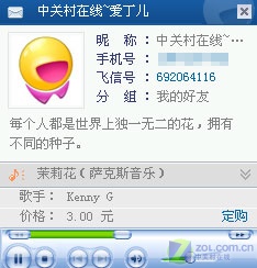 你可以點擊藍色文字鏈接,在彈出的窗口中單擊左下角的“播放/暫停”按鈕,以實現(xiàn)在PC機上聽好友彩鈴(如圖5)!這樣的功能其它IM軟件好像沒有,唯飛信才有的獨家功能!