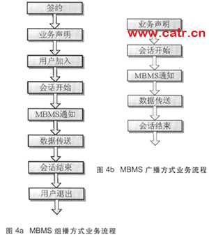 MBMS可應(yīng)用組播模式和廣播模式兩種業(yè)務(wù)模式。廣播模式接近于數(shù)字電視業(yè)務(wù),而組播模式專注和定位于群業(yè)務(wù)。組播模式提供了更好的計(jì)費(fèi)特性,包括服務(wù)訂閱、接入和推出功能,需要用戶簽約相應(yīng)組播組,進(jìn)行業(yè)務(wù)激活,并產(chǎn)生相應(yīng)的計(jì)費(fèi)信息,而廣播業(yè)務(wù)不需要小區(qū)中所有用戶都制定該業(yè)務(wù)便可以獲得。由于組播和廣播模式在業(yè)務(wù)需求上存在不同,導(dǎo)致其業(yè)務(wù)流程也不同(見圖4a、圖4b)。