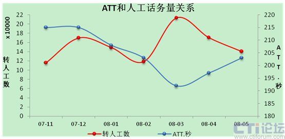 1. 人均話務(wù)壓力在80~120區(qū)間,ATT在215~190呈線性下降;