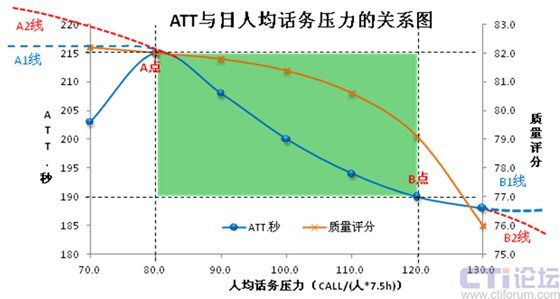 所以,在其它影響因素穩(wěn)定的情況下,當(dāng)人均話務(wù)壓力小于80或大于120的時候,ATT應(yīng)該保持在這兩個壓力點對應(yīng)的時長附近(即190~215秒,如A1和B1線走勢)我們暫且認為這是合理的波動范圍;若出現(xiàn)A2線走勢,浪費的必然是人員效率;若出現(xiàn)B2線走勢,犧牲的必然是服務(wù)質(zhì)量。