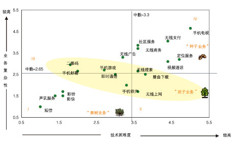 根據(jù)“業(yè)務(wù)復(fù)雜性—技術(shù)困難度”模型,可以清晰地看到一個(gè)業(yè)務(wù)的成功商用和業(yè)務(wù)復(fù)雜性與技術(shù)困難度密切相關(guān),如短信和彩鈴等復(fù)雜性與技術(shù)困難度都很低的業(yè)務(wù)是比較容易成功商用的,將這一類業(yè)務(wù)歸類為“果樹(shù)業(yè)務(wù)”,在第一象限(象限I)。還有一些業(yè)務(wù)如即時(shí)通信、整曲下載和無(wú)線搜索等業(yè)務(wù),已經(jīng)開(kāi)始快速增長(zhǎng)但是其用戶規(guī)模和收入量都還低于“果樹(shù)業(yè)務(wù)”,在業(yè)務(wù)復(fù)雜性與技術(shù)困難度坐標(biāo)中這類業(yè)務(wù)處于4個(gè)象限交匯的中部區(qū)域(即圖中黃色區(qū)域),由于業(yè)務(wù)復(fù)雜性和技術(shù)困難度都會(huì)隨時(shí)間而減小,從而這一區(qū)域的業(yè)務(wù)會(huì)向第一象限演進(jìn),這類業(yè)務(wù)稱為“苗子業(yè)務(wù)”,即在3年內(nèi)能夠成熟的業(yè)務(wù)。在坐標(biāo)系的右上角第四象限,即業(yè)務(wù)復(fù)雜性和技術(shù)困難度均較高的業(yè)務(wù),稱之為“種子業(yè)務(wù)”,這類業(yè)務(wù)在短期內(nèi)很難快速成長(zhǎng)。